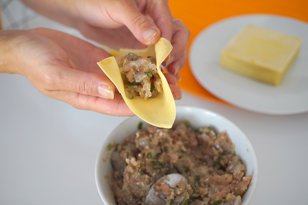 - Mix minced pork or chicken, minced shrimps, chopped spring onions, finely chopped salted cabbage (squeeze the cabbage dry), soy sauce, sesame oil, Shaoxing wine, sugar, grated ginger, grated garlic, corn starch, and white pepper powder.